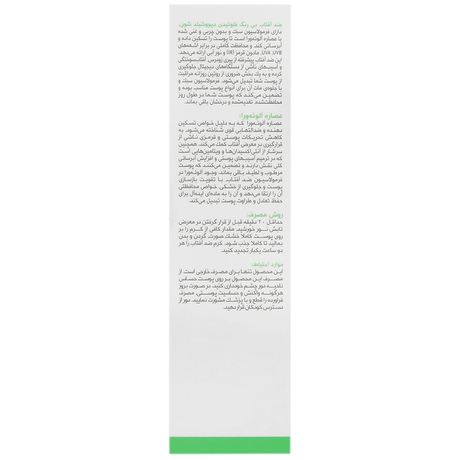 ضد آفتاب بی رنگ فلوئیدی دیووشیلد SPF50 شون با فرمولاسیون سبک و بدون چربی خود، از پوست در برابر انواع آسیبهای ناشی از آفتاب و عوامل محیطی محافظت میکند. این ضد آفتاب همچنین موجب حفاظت پوست در برابر اشعه های مادون قرمز و نور آبی می گردد.