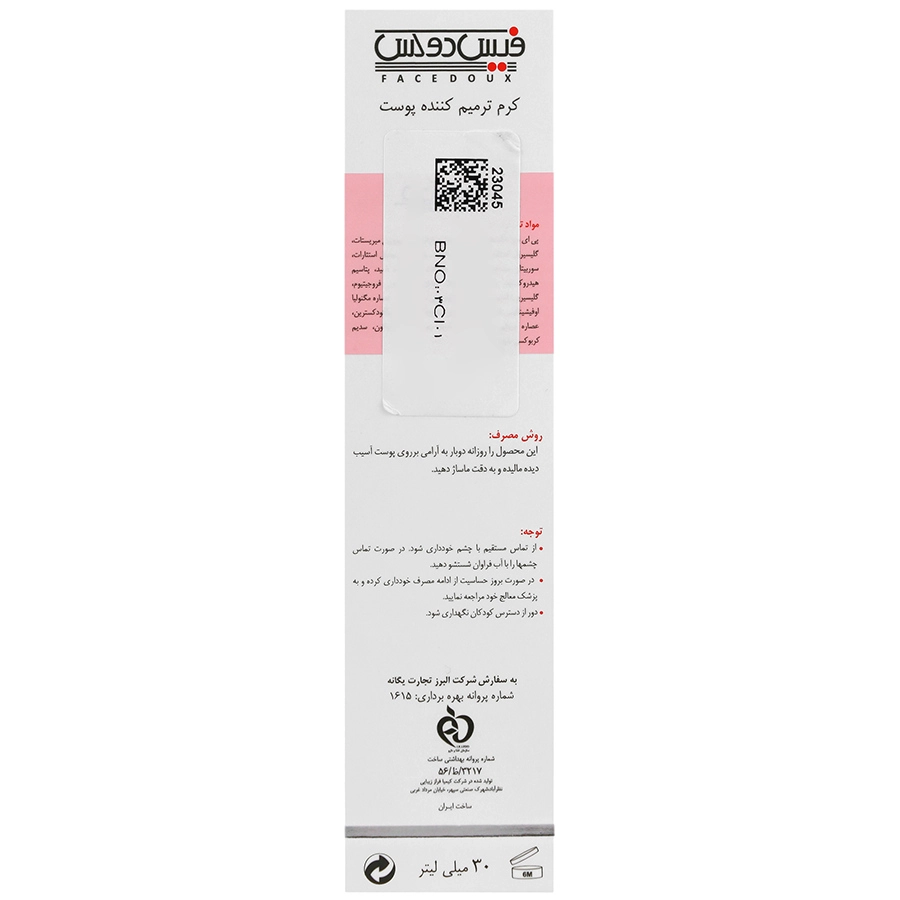 روزانه دو بار مقدار مناسبی از کرم ترمیم کننده فیس دوکس را روی پوست آسیب دیده و تمیز قرار دهید، سپس به آرامی ماساژ دهید.