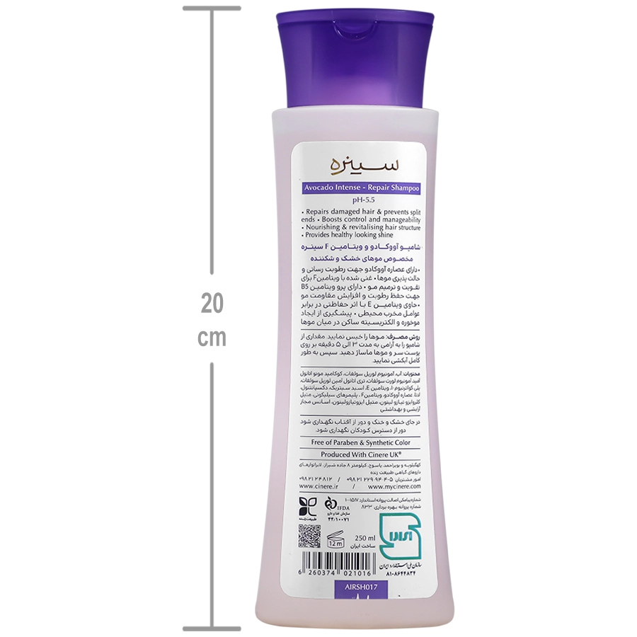 شامپو آووکادو سینره همچنین، مانع از شکسته شدن انتهای تارهای مو و بروز موخوره می شود و از ایجاد الکتریسیته ساکن در موها ممانعت به عمل می آورد. لازم به ذکر است که این شامپو، مخصوص افراد دارای موهای خشک و شکننده طراحی شده است.