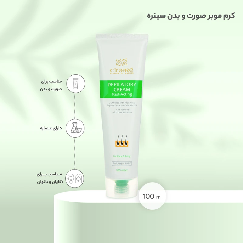 استفاده از کرم های موبر از جمله بی ضررترین و مقرون به صرفه ترین روش ها جهت رفع موهای زائد می باشد. کرم های موبر در مقایسه با روش هایی مانند استفاده از ژیلت در رفع موهای زائد اثربخشی به مراتب بالاتری دارند و بر خلاف ژیلت که موجب قطع تار مو از سطح پوست می شود، به نواحی عمیق تر از سطح پوست که ریشه مو در آن جا قرار دارد نفوذ می کند و باعث کند شدن سرعت رشد موهای زائد می شود. کرم موبر سینره، با داشتن عصاره پاپایا در کاهش فعالیت پیاز مو و رفع انواع موهای زائد بسیار موثر است. کرم موبر سینره دارای ترکیبات التیام بخش و ضد التهاب آلفا بیزابولول، آلوئه ورا و روغن کالاندولا و روغن بادام می باشد و در تسکین پوست و جلوگیری از ایجاد حساسیت، قرمزی و خارش نقش مهمی دارد. آلوئه ورا و روغن بادام آبرسان موثر پوست هستند، بنابراین کرم موبر سینره به مرطوب نگه داشتن پوست و جلوگیری از ایجاد خشکی و دهیدراتگی کمک می کند. وجود عصاره پاپایا و آلفا بیزابولول در کرم موبر سینره باعث شده اند تا این کرم خواص ضد میکروبی و ضد قارچی داشته باشد.