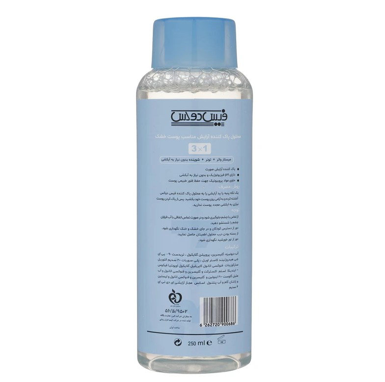 میسلار مناسب پوست خشک فیس دوکس نیاز به آبکشی ندارد و در موقعیتهای حساس که دسترسی به آب وجود ندارد و یا اینکه بهترین گزینه برای پاک کردن پوست است. این میسلار واتر دارای PH نزدیک به پوست و بدون نیاز به آبکشی است.